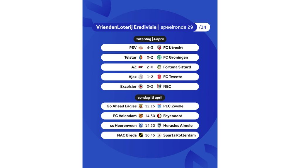 En dit was ‘m dan voor vandaag. Morgen staan er dus vier wedstrijden op het programma en PSV zou zomaar, zonder te spelen, kampioen kunnen worden. Of dat ook gebeurt, lees je uiteraard in ons liveblog.