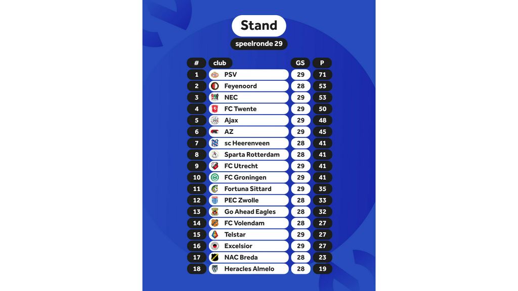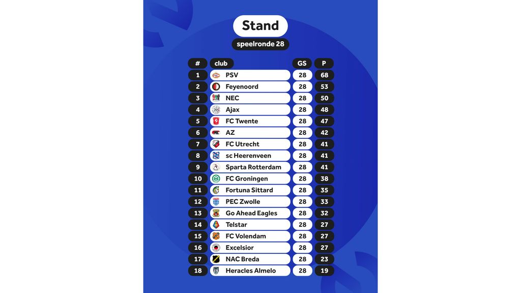 Er zijn nog een paar speelrondes te gaan en dus worden de punten steeds belangrijker. PSV kan bijvoorbeeld dit weekend kampioen worden. Daarvoor moet het thuis weten te winnen van FC Utrecht en moet Feyenoord zondag een minder goed resultaat behalen dan PSV.