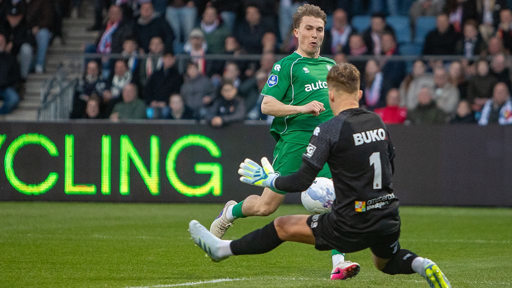 En daar is dan de treffer voor NEC! Het lukt de Nijmegenaren een keer om eruit te komen en dan is het ook meteen raak. Nejasmic heeft een uitstekende steekpass in huis op Linssen. De aanvaller dribbelt om de doelman heen en rondt uitstekend af.