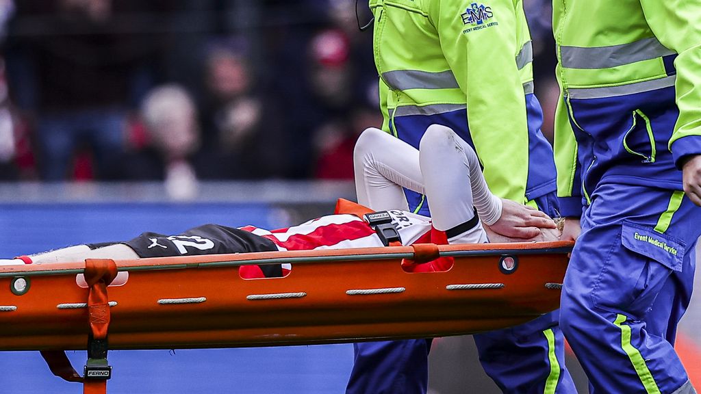 Jerdy Schouten grijpt naar zijn knie en gaat op de grond zitten. De centrale verdediger van vandaag raakt geblesseerd en moet er op een brancard vanaf.