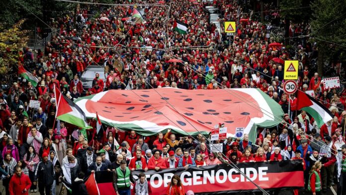 De demonstranten, in het rood gekleed, eisen van het Nederlandse kabinet actie tegen Israël om het genocidale geweld in Gaza te stoppen. Bij de vorige twee edities van het Rode Lijn-protest, in Den Haag, waren er volgens de organisatie 100.000 en 150.000 mensen aanwezig.